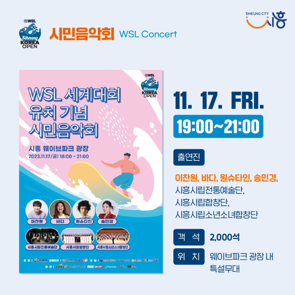 경기도 시흥 주민분들께 즐거운 소식이 있습니다. 초청공연(이찬원, 바다, 원슈타인, 송민경), 전통예술단, 합창단, 소년소녀합창단 등 가족 연인과 좋은 추억을 쌓을 수 있는 WSL 세계대회 유치 기념 시민음악회에 방문해 보는 것은 어떨까요.