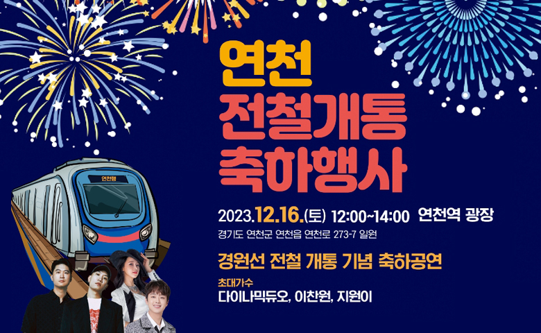 경기도 연천 주민분들께 즐거운 소식이 있습니다.초대공연(다이나믹듀오, 이찬원, 지원이) 등 가족 연인과 좋은 추억을 쌓을 수 있는 연천 전철개통 축하행사에 방문해 보는 것은 어떨까요.